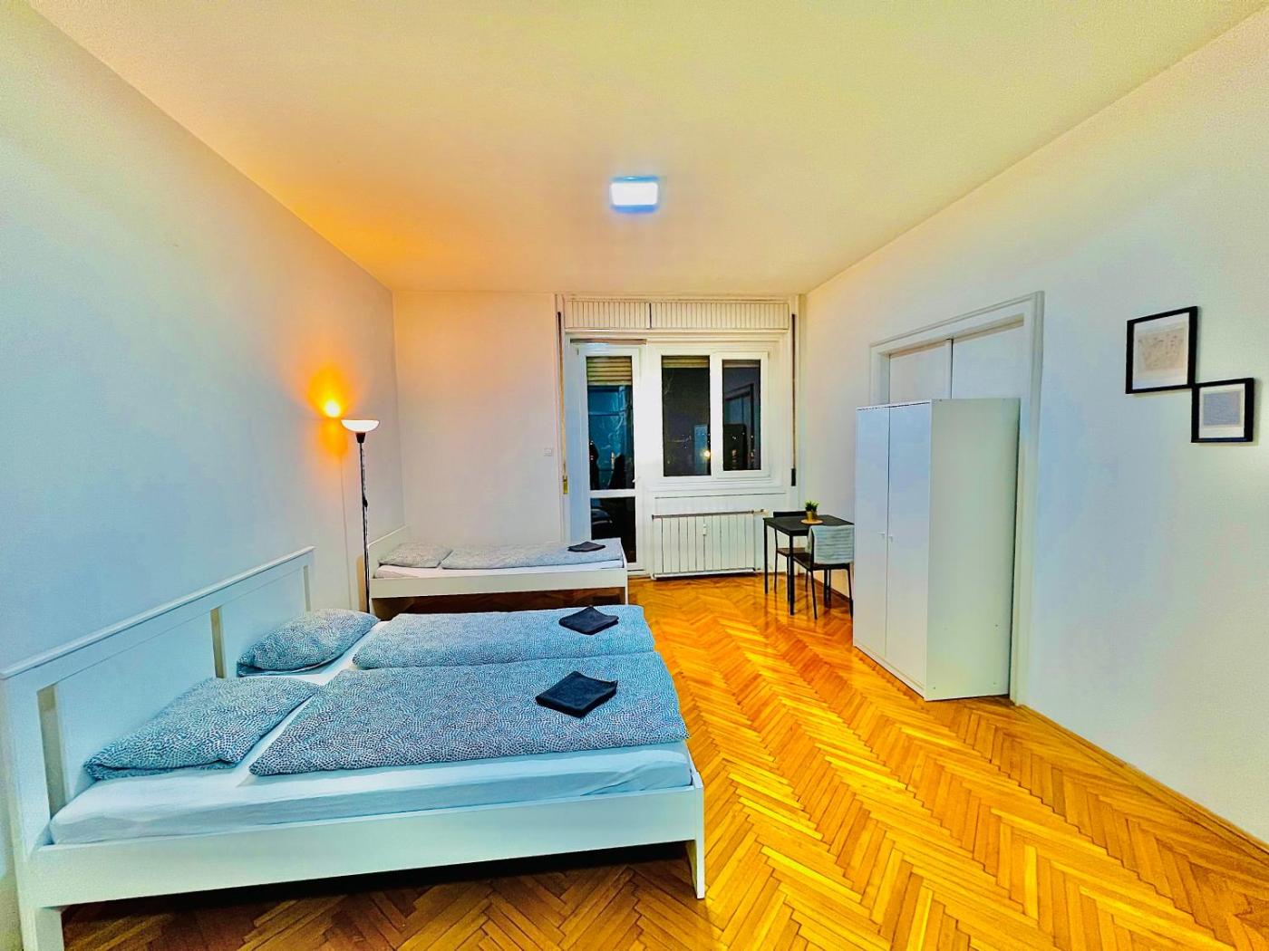 Deluxe Quadruple Room. Offering free toiletries, this quadruple room includes a shared bathroom with a bath, a shower and a hairdryer. The quadruple room offers a tea and coffee maker, a wardrobe and heating. The unit has 2 beds. ;