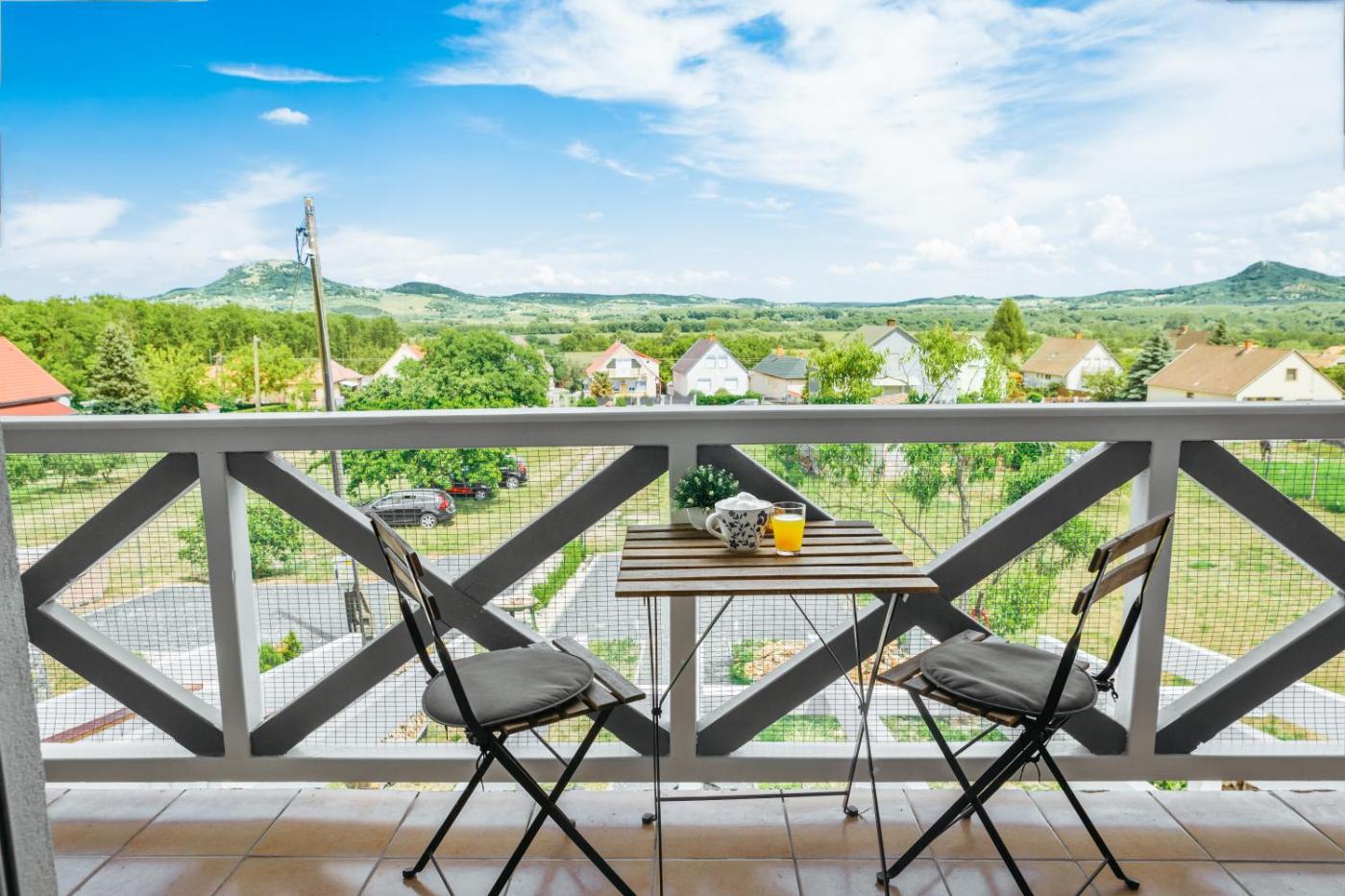 Three-Bedroom House. Our most spacious and comfortable house is Apartment D1. It can accommodate up to 8 people. From the living room you can enjoy a cosy terrace overlooking the views of Csobánc, Tóti Hill, Gulács and Badacsony, which are different and fascinating in every season. An outdoor diningand barbecue make being outside comfortable. On the lower level of the house there is a well-equipped living-kitchen-dining room with fridge-freezer, a spacious bathroom with shower and toilet, and a double bedroom next to it. Upstairs there are two bedrooms with four large single beds, which are pushed together in one room and separate in the other, a separate bathroom with shower cubicle and balcony. In summer, both floors are air-conditioned. Mosquito screens are installed to protect against insects. Equipment: fridge, ceramic hob, microwave, coffee maker, toaster, kettle, air conditioning, mosquito nets, fan. Baby equipment available on request: travel cot, changing mat, bath tub, high chair, step stool. ;
