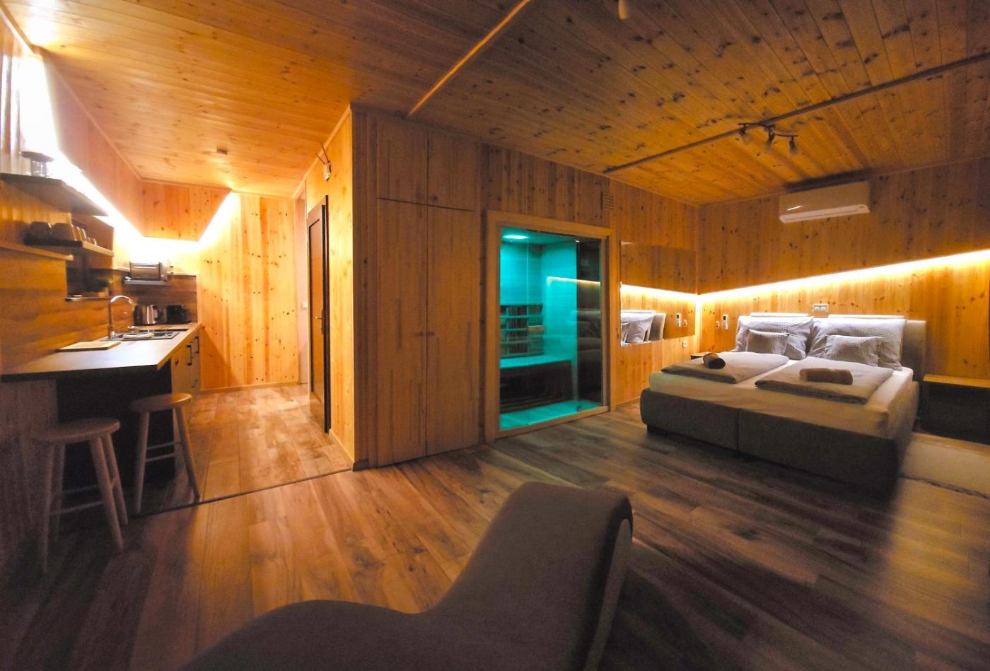 One-Bedroom Apartment. This apartment features a private pool, hot tub and sauna. Guests can make meals in the kitchen that has a stovetop, a refrigerator, a dishwasher and kitchenware. The air-conditioned apartment features a flat-screen TV with streaming services, a private entrance, a tea and coffee maker, a wardrobe as well as garden views. The unit has 1 bed.